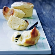 Pour the batter into 12–16 small ovenproof ramekins that have been greased with butter. Bake in a water bath: place the ramekins in a baking dish with edges, and pour boiling water from a kettle into the dish until it reaches halfway up the sides of the ramekins. Place in an oven preheated to 180 °C (350 °F) for 30–35 minutes: the batter should turn into a soufflé.