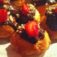 In a saucepan, bring water, butter (30 g), salt, and sugar (7 g) to a boil. Add flour and quickly mix until smooth. Cook the dough over heat for about 2 minutes. Remove from heat and beat in the eggs one at a time, mixing until smooth. Pipe small balls onto parchment paper (not too close together) and place in a preheated oven at 356°F for 15 minutes, then open the oven for a couple of seconds and bake for another 15 minutes. Allow the finished profiteroles to cool.
