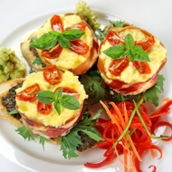 Cut the pieces of prosciutto in half and line 8 muffin cups with them, allowing the edges to hang over.