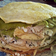 Place the first pancake on a plate, spread cottage cheese on top, then add the chicken, and then a lettuce leaf. Place the next pancake on top, and so on (do not add anything to the last pancake).