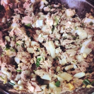 Dice the onion and eggs, drain the juice from the tuna, and add to the other ingredients.