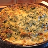 Prepare the filling: whisk together the eggs, sour cream, milk, and cheese, then add the garlic (minced) and a handful of finely chopped herbs (I use parsley).