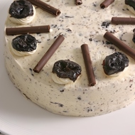 Soak the sponge cake layers in the syrup, spread with custard, and layer with prunes. The thickness of the prune layer should be at least the thickness of the cake layer. Cover the sides and top of the cake with custard. Sprinkle the cake with grated chocolate.