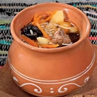 Strain the broth, season with salt and pepper. Cut the meat into pieces and return it to the broth. Add the vegetables, bring to a boil. Add the rice and prunes, and cook for 15 minutes.
