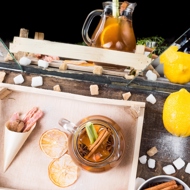 Next, garnish with lemongrass, orange, cinnamon, star anise, and powdered sugar.