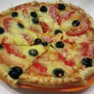 Spread tomato paste over the pastry, layer the sausages, then the tomatoes, spread with mayonnaise, add the mushrooms, and sprinkle with cheese.