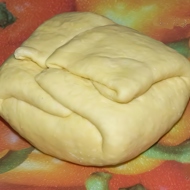 Now let's prepare dough 2. Pour the flour into a bowl. It is better to take a little less flour at first because the dough should be soft, not stiff, and then add more during the kneading process. Add vinegar (or lemon juice) and salt to the flour. Crack the egg into a glass. Add water to make 2/3 of a glass of liquid. I usually use boiled water at room temperature, which is always available in my kitchen, so the water temperature is not critical! Lightly whisk with a spoon to mix the egg with the water, and pour it into the flour. Knead the dough well, first with a spoon, and then with your hands on a floured surface. Add flour as needed. This dough should not be stiff at all, otherwise, it will result in tough puff pastry. Now roll out dough 2 into a small rectangle. Not too thin, otherwise, it will break later. Place the first dough closer to one edge in the middle so that it can be wrapped like an envelope. Now fold it, first covering it with the nearest edge. Then fold the sides. Finally, close it with the remaining 'tail'. We get the first dough in an envelope. Place the dough on a floured plate and send it to the refrigerator for 30 minutes. Place the dough 'seam' side down to better secure the edges. When sending the dough to the refrigerator, do not cover it with anything. Otherwise, droplets will form, and the dough will become wet, which we do not want at all. After 30 minutes, take the dough out of the refrigerator, place it on the rolling surface in the same way it was on the plate, and roll it out with a rolling pin, not too much, just enough to be able to fold it like an envelope again. Fold it and send it back to the refrigerator for 30 minutes. After 30 minutes, take the dough out. Roll it out on a floured surface and fold it into an envelope again. Send it to the refrigerator for 30 minutes. Now our dough is ready. You can start cooking with it right away.