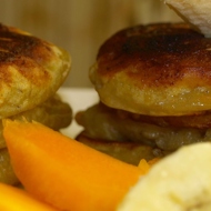 Add olive oil to a preheated skillet. Spoon small pancakes onto the skillet and cook.