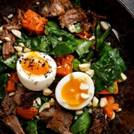 Wash the spinach, remove large stems, and chop coarsely, add the warm cooked pumpkin, dress with unagi sauce, olive oil, and lemon juice, place the warmed brisket coated in unagi and demi-glace, tear it slightly, and garnish with chopped almonds, halved egg, and finely chopped dried olives.