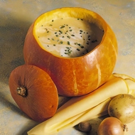 Close the pumpkin with the 'lid' and place it in a well-heated oven at 180-392°F for 40 minutes. Serve the finished soup directly in the pumpkin.