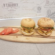 Assemble the burgers: drizzle the buns with sauce, place the first pumpkin patty, cheese, tomato, the second pumpkin patty, lettuce, sauce, and the second half of the bun.