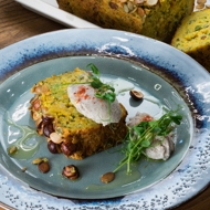 For the mushroom mousse, dice 100 grams of onion and sauté it with chopped mushrooms, thyme, and rosemary for 10 minutes. Pour in the coconut milk and reduce until thickened. Season with salt and pepper to taste. Blend until smooth. Serve the mousse warm alongside the casserole.