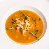 For the soup base: cut the pumpkin randomly, add olive oil, ginger, and lemongrass, then heat and sauté for 5 minutes. Pour in the vegetable broth, bring to a boil, add coconut milk, cover, and simmer for 1.5 hours. Blend the finished soup, strain, bring to a boil, and add salt/pepper to taste.