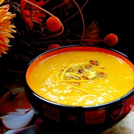 Puree the soup in a blender, season again. Pour into bowls and garnish with pistachios and orange zest.