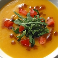 Pumpkin Cream Soup with Pear and Arugula