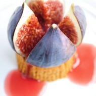 For presentation, cut off the top of the cupcake evenly and place it upside down on a plate. Make a cross-cut in the fig and place it on top of the cupcake. Using a teaspoon, carefully drizzle raspberry syrup over the fig on the cupcake so that the syrup flows down the sides of the cupcake onto the plate.