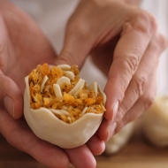 Finely chop the onion in a blender. Mix with the pumpkin and thoroughly combine the filling.