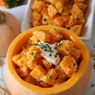 Peel the pumpkin and remove the seeds. Boil in salted water and dry slightly.