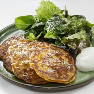 Place the pancakes on plates, top with a mixed salad, and sprinkle with cheese. Serve with yogurt or sour cream.