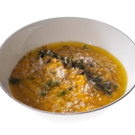 Add grated Parmesan cheese and olive oil to the blender, then blend the pumpkin until smooth. Season with salt and pepper to taste.
