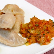 Prepare the filling. Finely chop or grate half of the pumpkin (200g) and squeeze out the juice. Add salt, half a finely chopped onion, a pinch of turmeric, and a dash of nutmeg.