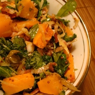 While the pumpkin is baking, slice the smoked bacon into thin strips and fry it (you can do this without oil) until golden brown. Carefully remove the bacon with a slotted spoon and place it on parchment paper or several layers of paper towels to absorb excess fat.