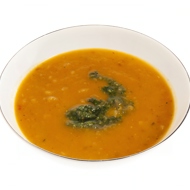 Blend the soup until smooth. At this point, you can add water if needed. Bring the soup back to a boil, then add the juice of a quarter lemon, cardamom, cinnamon, chili flakes, black pepper, and salt to taste. Finally, add the cooked lentils and serve with parsley pesto.