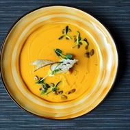 Combine the pumpkin with the ginger, sautéed mixture, and cream, then blend with an immersion blender, gradually adding the pumpkin broth until the desired consistency is reached. Heat the soup in a saucepan and season to taste with salt, pepper, sugar, and soy sauce.
