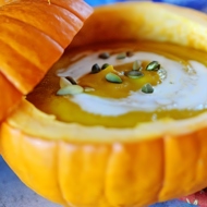 Pour the soup into this pumpkin, add the cream, and sprinkle with roasted seeds.