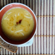 When the onion is lightly browned, add the pumpkin, nutmeg, and rosemary; simmer until the pumpkin is soft (adding a little vegetable broth during the process).