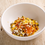 Mix the dried pumpkin with cottage cheese, using a ratio of 100 grams of pumpkin to 25 grams of cottage cheese. Season with salt, add honey and vegetable oil, mix well, and transfer to a plate next to the pumpkin cream. Top with seeds and pistachios. If desired, you can garnish with microgreens or edible flowers.