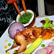 Marinate the quail in coconut milk (not to be confused with coconut water) with red onion and salt.