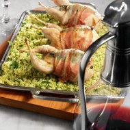 Meanwhile, sauté the bulgur in a saucepan with clarified butter for one minute, add sugar, and pour in the chicken broth. Cook on low heat, stirring constantly, for fifteen minutes. Season with salt and pepper, and mix in finely chopped cilantro, basil, and mint leaves, as well as the sauce that forms from the quail in the oven on the baking sheet.