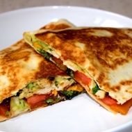 Assemble the quesadilla. On one half of the tortilla, layer in order: guacamole, chicken breasts, cheddar cheese, tomatoes with cilantro, and strips of roasted pepper.
