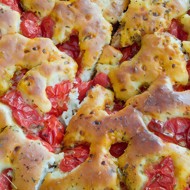 Pour the batter into the pan, smooth it out, and place the remaining half of the cherry tomatoes cut side up on top, gently pressing them into the batter. Bake for 40-45 minutes until cooked through and golden brown. Leave in the pan for 5-10 minutes and transfer to a board. Slice and serve warm.