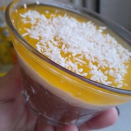 Next, add the jelly, pour the final layer, and leave until fully set. Decorate with coconut flakes.