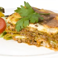 Take a baking dish measuring 30x20 cm. Place a sheet of dough at the bottom, then a layer of half the meat sauce and 1/3 of the white sauce. Then add another layer of dough, the remaining meat sauce, and a third of the white sauce. Cover with the remaining sheets of dough and pour the white sauce over the top.