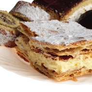 Sift the flour, mix it with salt, and knead the dough with the chopped butter, gradually adding water. Roll the resulting dough into a rectangle, place the refrigerated butter in the center, fold the edges, and roll it out. Then fold it into thirds and roll it out again.