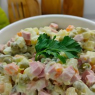 Add equal amounts of mayonnaise and sour cream to the salad for dressing.