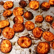 After 20 minutes, remove the potatoes (they should be slightly undercooked) and slice them into rounds about 0.5 cm thick.