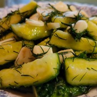 Next, slice them into pieces (first cut them in half lengthwise, then cut each half in half lengthwise again, and finally cut the long wedges crosswise — this way, one cucumber will be cut into eight pieces).