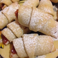 Combine the flour with water, add the oil, and knead the dough until it is similar to noodle dough. Divide it into 3 parts and roll each part into a circle. Cut the circles into wedges like a pizza, and place jam (or thick preserves) on the wide edge of each wedge.