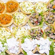On top of the cucumbers, place the meat filling. The next five tartlets are filled with the cheese and egg filling.