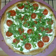 Place the suluguni cheese and halved cherry tomatoes on top. Sprinkle with pepper and a mixture of Provencal herbs.