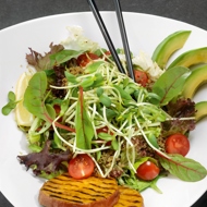 Arrange the salad leaves (lollo rosso, romaine, corn, arugula, chard) on the plates. Top with warm quinoa (or cold if it's hot outside). Then add the tomatoes (cut in half) and sunflower sprouts.