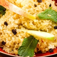 To the quinoa, add peeled and diced apples, finely chopped celery, raisins, parsley, and chopped almonds. Mix well. Add the dressing and mix again. Season with salt and pepper.