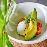 Top with a poached egg and a slice of avocado. Sprinkle the dish with dill.