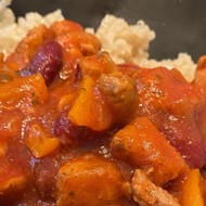When all the vegetables are soft, add the meat, spices, a little water (approximately 200 ml), and simmer for 20-30 minutes until the meat is tender. At the end, add the canned beans and garlic, mix everything, and let it sit for a few more minutes.