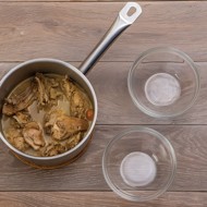 Pour 370 ml of dry white wine into the pot, evaporate the alcohol over high heat for 5 minutes; add the broth so that it covers the rabbit; cover with a lid and simmer on low heat for 90 minutes.