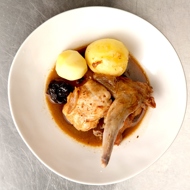 Add dark beer, thyme, bay leaf, prunes, and mustard. Simmer over low heat for 15 minutes. Add the rabbit to the sauce and braise covered on low heat for 45-60 minutes. Serve with apple sauce or boiled potatoes.